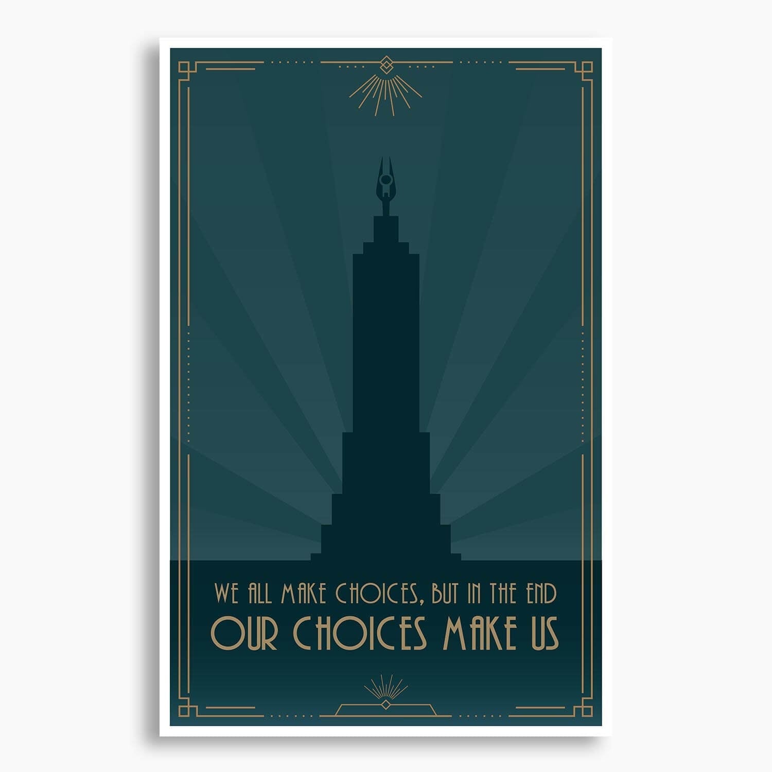 Bioshock - In The End, Our Choices Make Us Poster showcasing One of the most iconic scenes in gaming history. Enter the historic Lighthouse from the Bioshock series. This beautiful illustration featuring an Art Deco-style and a beautiful lighthouse design will give you a one-of-a-kind talking piece to show off! We all make choices, but in the end, our choices make us. Choose this poster, today!